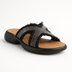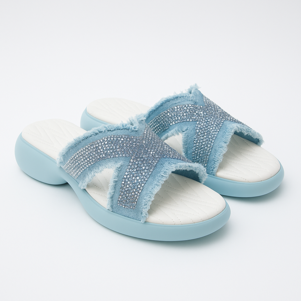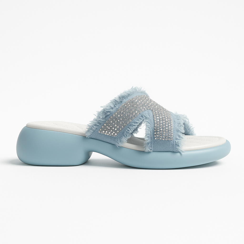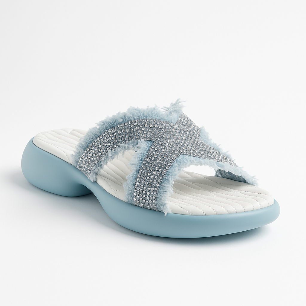 Arctic Glow brings a cool, radiant touch to your everyday style. With sparkling crystal-studded straps and soft frayed edges, these sandals strike the perfect balance between casual charm and modern glam. The cushioned sole ensures lasting comfort, while the icy blue tones make every step feel fresh and effortless.
