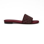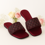 Elevate your style with the Zyra Flats, crafted in rich maroon satin for a luxurious finish. The wide strap is beautifully hand-embellished with shimmering crystals and beads, forming a delicate lattice pattern that catches the light with every step. Designed with a comfortable flat sole and open-toe silhouette, these slides are perfect for festive gatherings, evening outings, or casual celebrations where comfort meets elegance. Pair them with traditional wear for weddings and parties or style them with contemporary outfits for a chic fusion look.