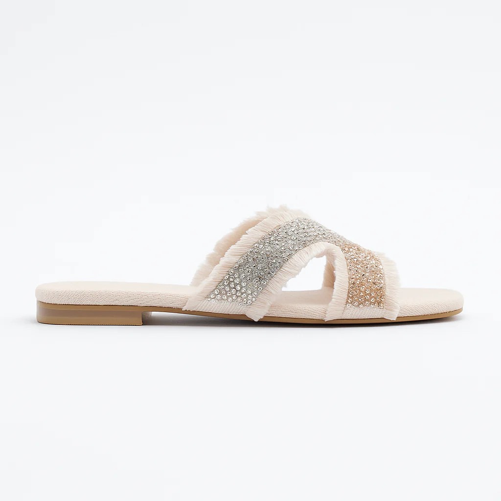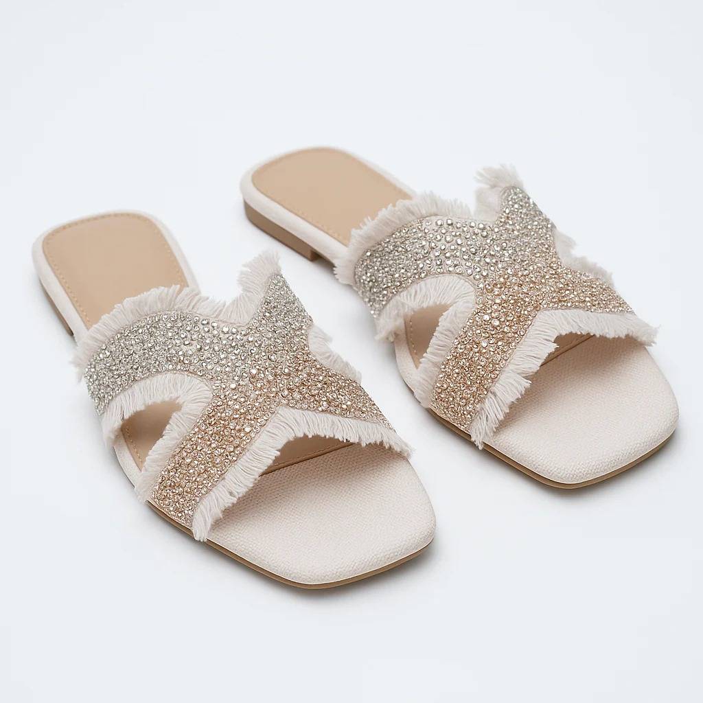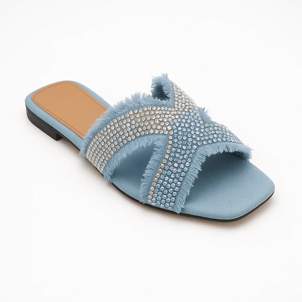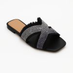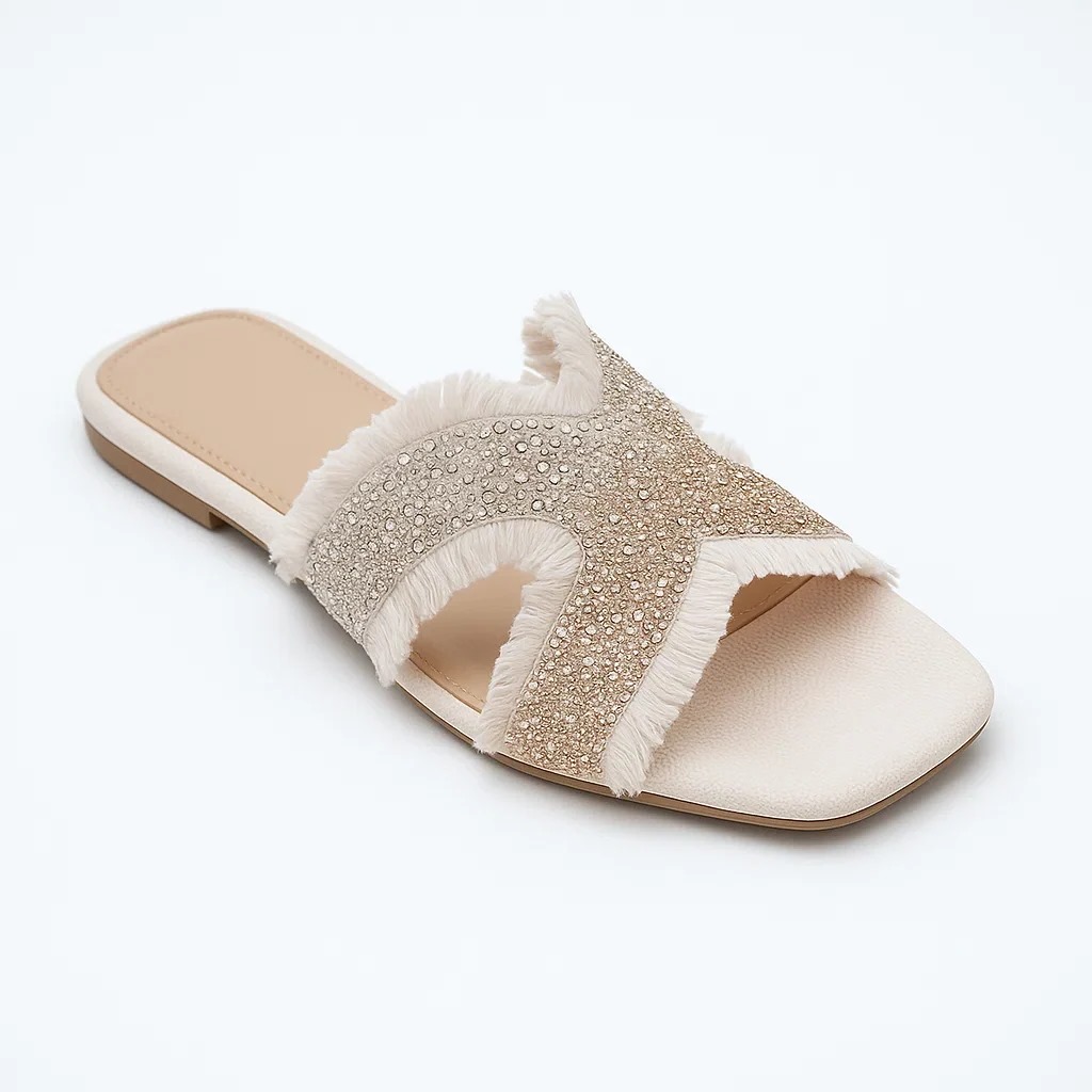 Turn every step into a statement with Dazzle Glam Slides. Designed with shimmering rhinestone embellishments and soft fringe details, these slides blend comfort with effortless sparkle, perfect for both casual chic and evening glam.