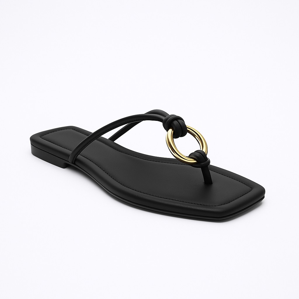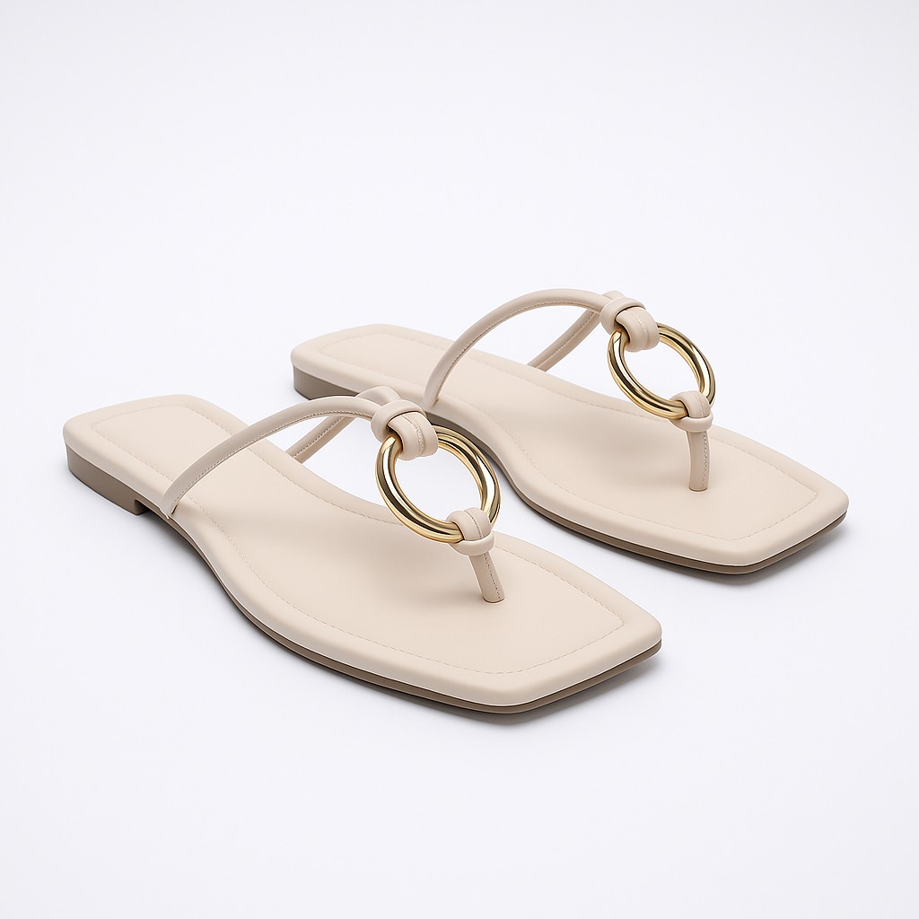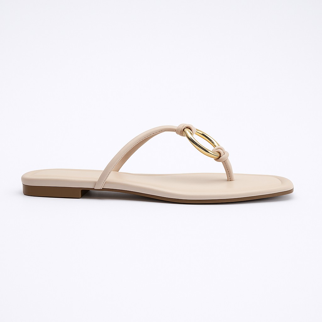 Step into effortless style with these sleek and modern sandals. Designed with a minimalist beige leather base and accented with striking gold rings, these flats offer the perfect balance of elegance and comfort. Ideal for both casual outings and stylish evenings, they’re a versatile addition to any wardrobe.