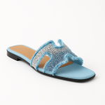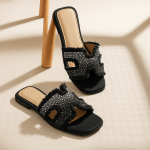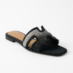 Noir Glimmer brings a bold touch of elegance to your look. Designed with a sleek black base and sparkling crystal embellishments, these sandals fuse modern edge with effortless glamour. The frayed detailing adds texture and charm, making them perfect for both casual chic days and evening outings.