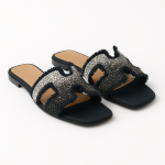 Noir Glimmer — black slip-on sandals with crystal-studded straps, frayed accents, and a chic square-toe design.