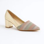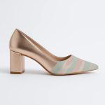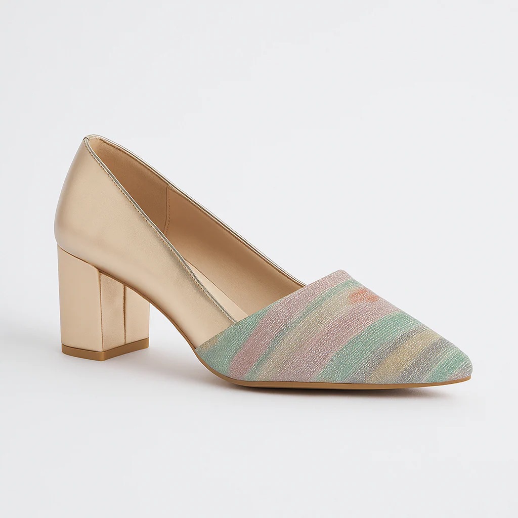 Step into vibrant elegance with Prism Glow, a pair of block-heeled pumps that merge modern sophistication with playful shimmer. The soft metallic gold body pairs beautifully with a pastel prism-patterned toe, creating a chic and versatile statement for any occasion.
