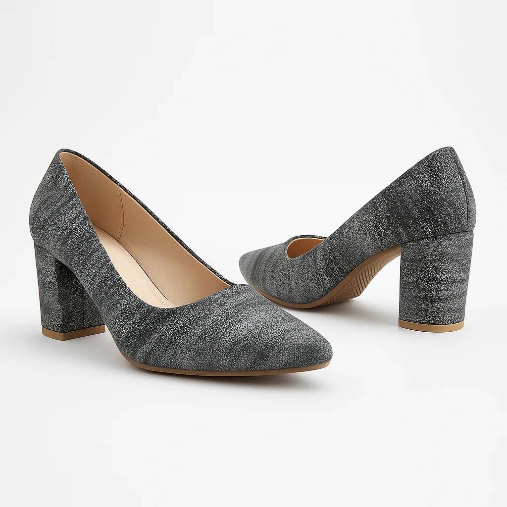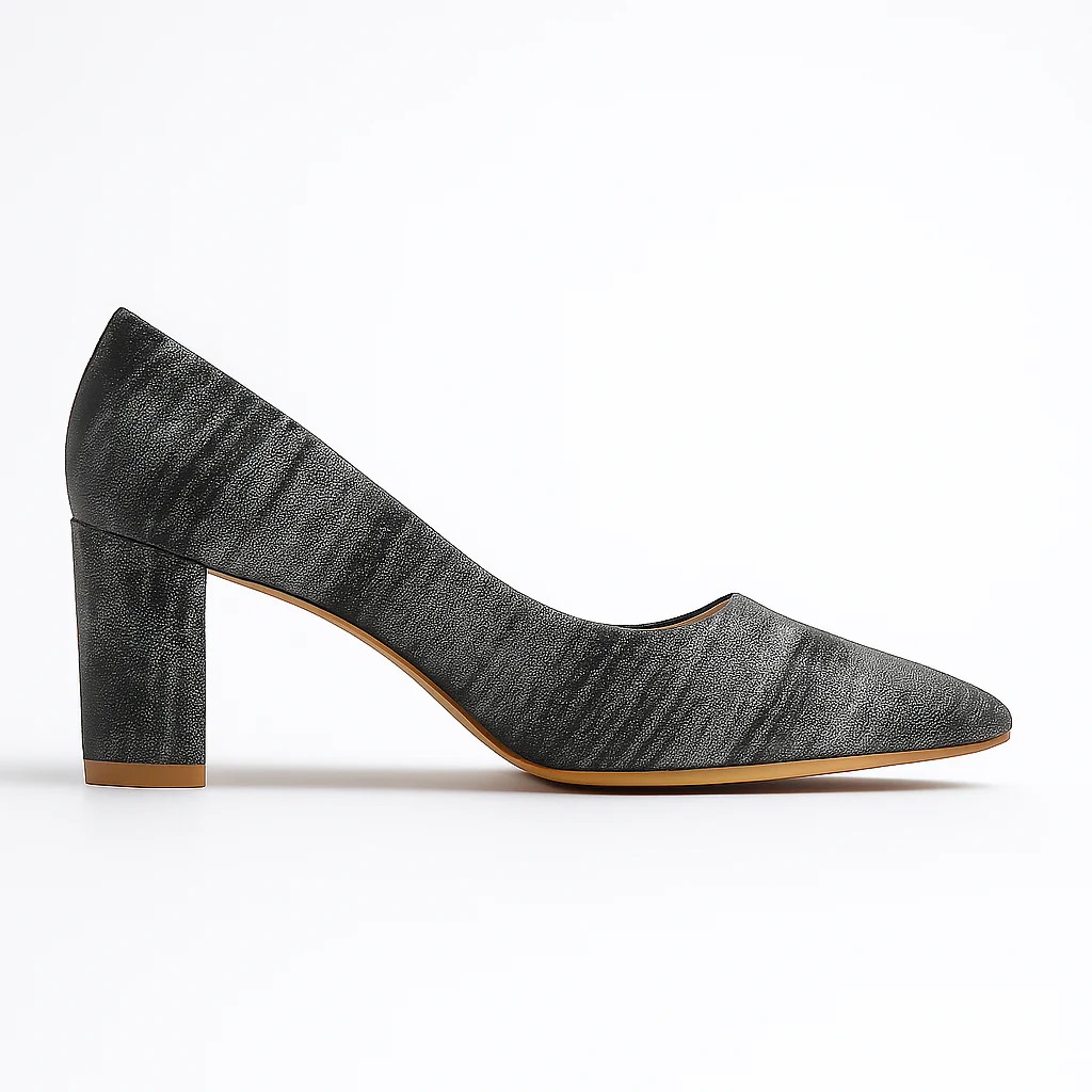 Elevate your look with Twilight Edge, sleek block-heeled pumps that blend timeless elegance with a modern edge. The textured charcoal-black finish adds depth and versatility, making them perfect for both day-to-night styling.